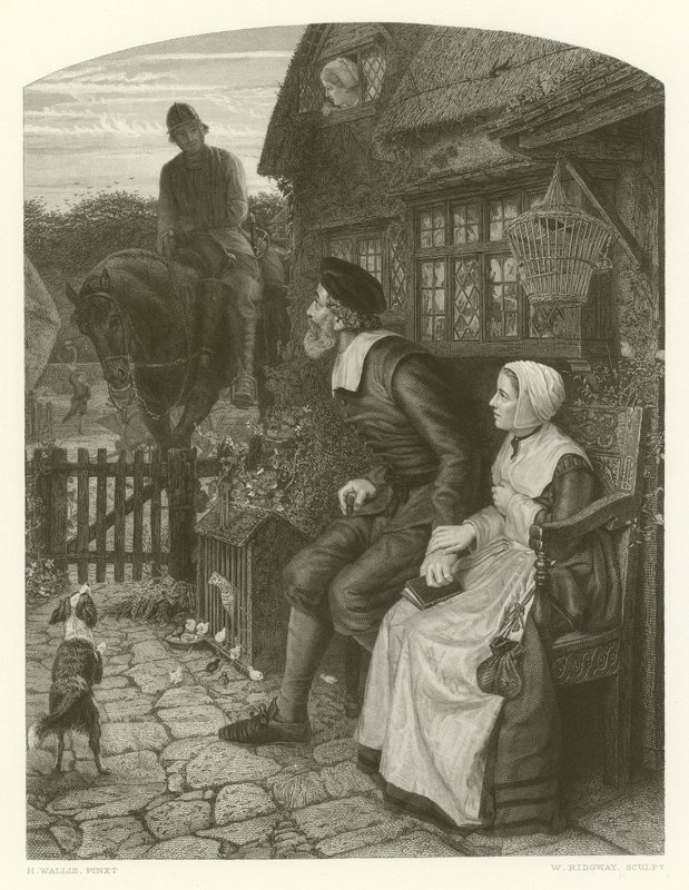 marston moor · english · civil · soldiers · cottage · farm · parents · relief · happiness · roundhead · puritans · chickens · thatched · barking · home · coming · Private Collection / Bridgeman Images · / Look and Learn |