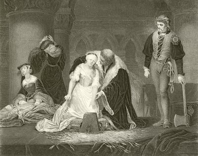 16th century · beheading · execution · united kingdom · europe · nobility · royalty · house of tudor · decapitated · female · mourning · rulers · female mourners · young · royal · blindfolded · england · executioner · britain · british · crying · weeping · teenager · english · blindfold · engraving · mzengraving · Private Collection / Bridgeman Images