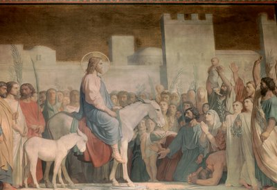 Christ's Entrance to Jerusalem on Palm Sunday (Detail)(Christ's entrance to Jerusalem on Palm Sunday: the inhabitants greet him with joy by spreading their clothes on the floor, wielding olive branches. Detail of a fresco by Hypolithe Flandrin (1809-1864) 19th century Church of Saint Germain des Pres, Paris)Hippolyte Flandrin |