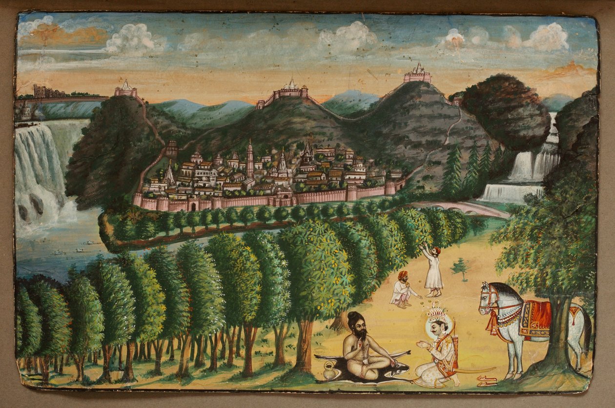 india · indian · asia · asian · landscape · rural · countryside · aerial view · town · townscape · scenic · picturesque · river · waterfall · waterfalls · wood · woods · forest · male · hermit · prince · status · poor · rich · wise · wisdom · advice · kingdom · royal · royalty · ruler · monarch · city · cityscape · hills · Private Collection / Bridgeman Images |