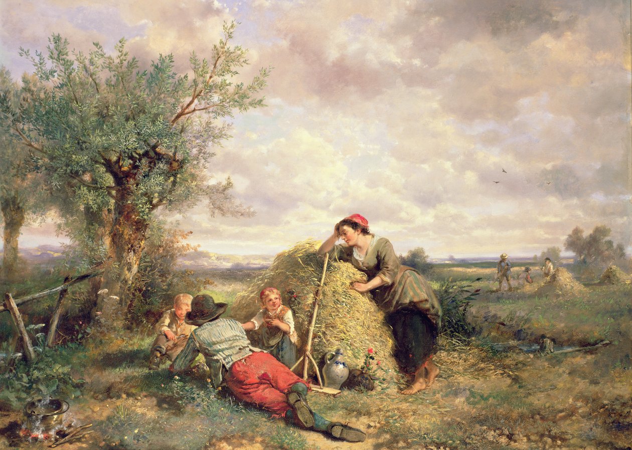 work · lunch · rest · rake · rateau · meule · haystack · Josef Mensing Gallery, Hamm-Rhynern, Germany / Bridgeman Images |