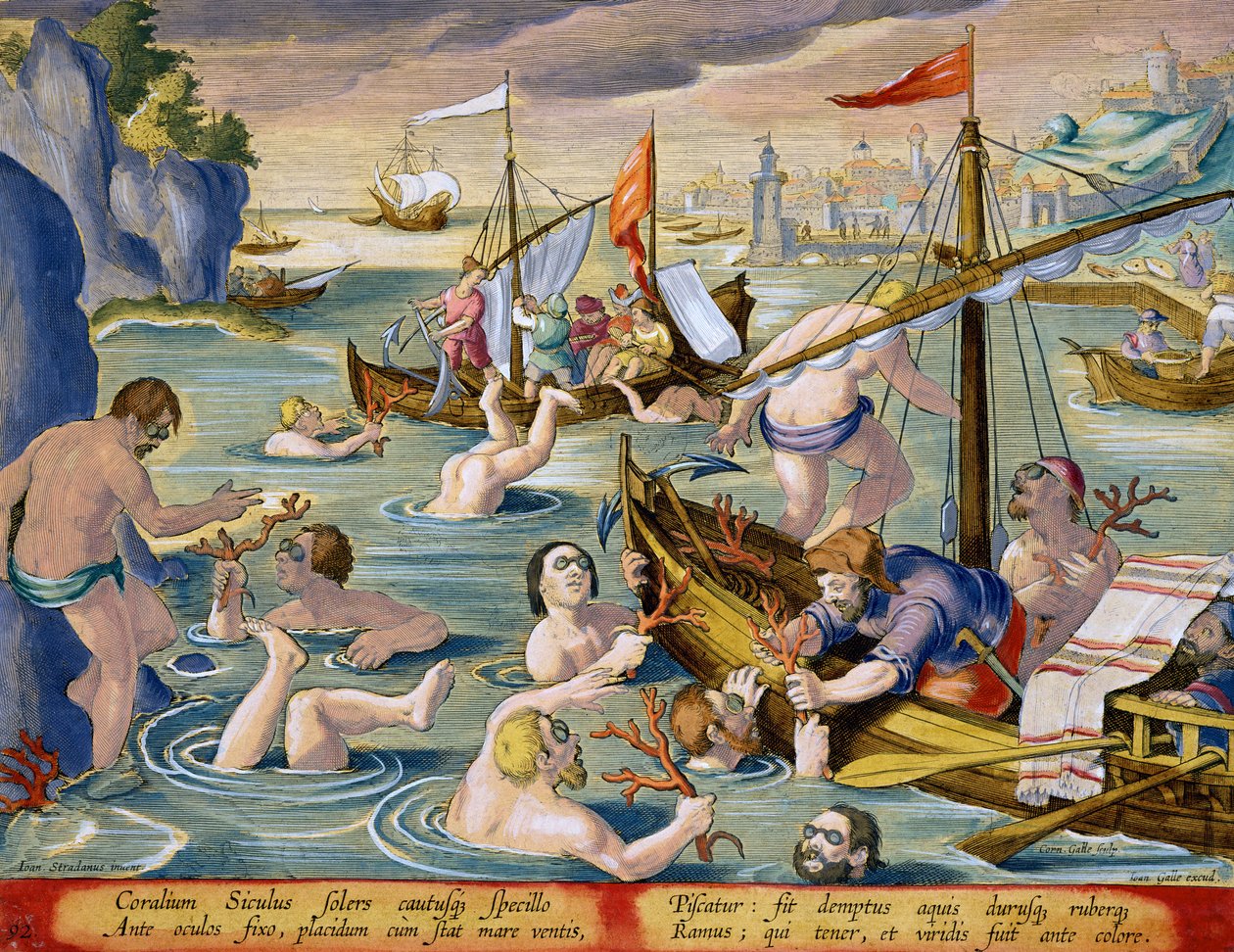 Diving for Coral, plate 92 from 'Venationes Ferarum, Avium, Piscium' engraved by Jan Collaert, published by Phillipus Gallaeus of Amsterdam(Diving for Coral, plate 92 from 'Venationes Ferarum, Avium, Piscium' (Of Hunting: Wild Beasts, Birds, Fish) engraved by Jan Collaert (1566-1628) published by Phillipus Gallaeus of Amsterdam (hand colo)Jan van der Straet |