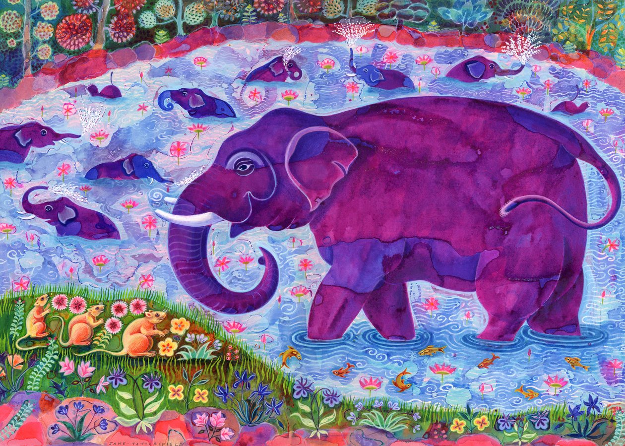 elephant · mice · mouse · india · indian · colour · landscape · water · trunks · elephants · flowers · trees · purple · waterlillies · waterlilly · Private Collection / Bridgeman Images |