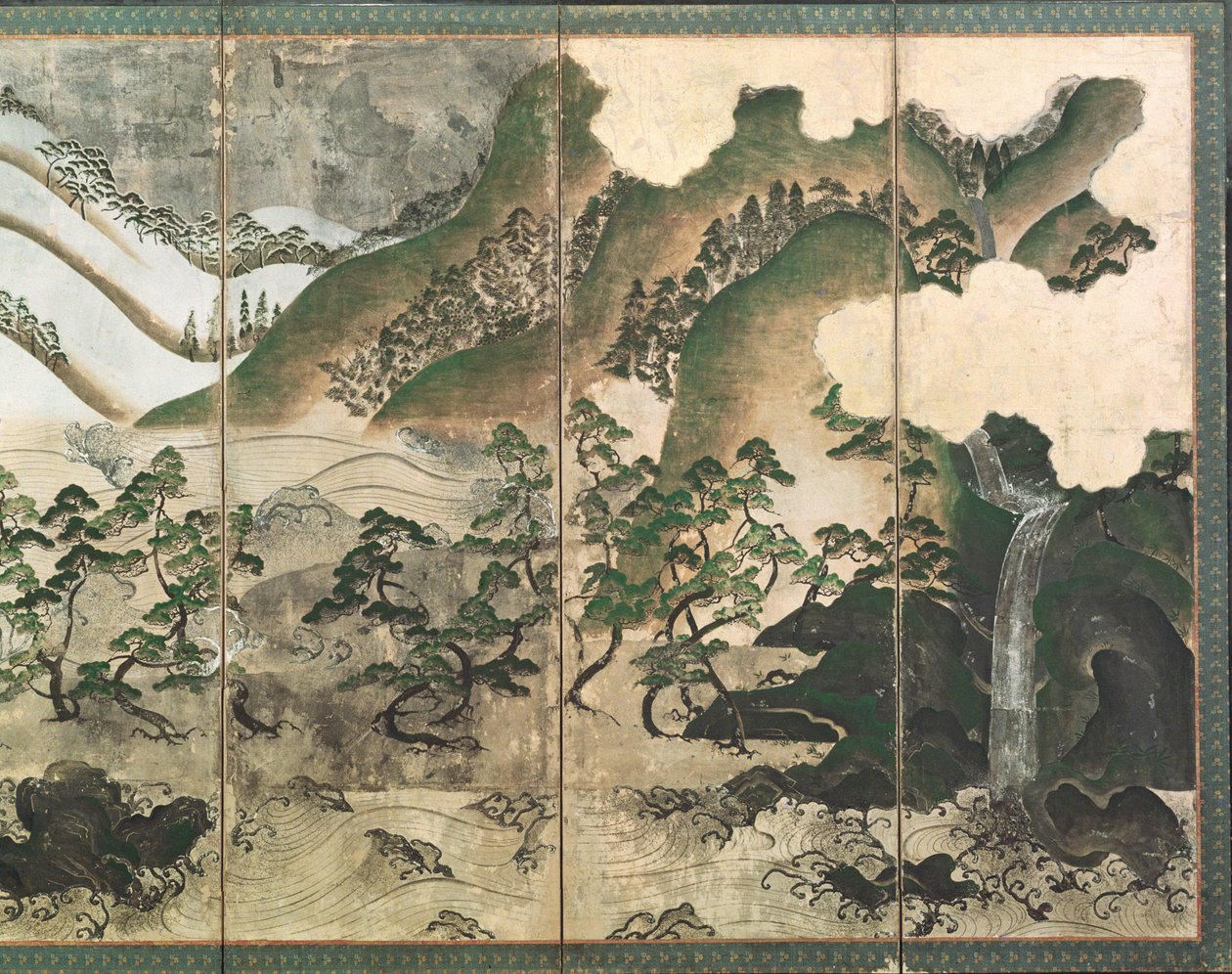 right panel · mountains · forest · snow · covered · hills · mountain · hill · monoyagam period · decorative · furniture · clouds · waves · swell · surf · Kongo-ji Temple, Osaka, Japan / Bridgeman Images |