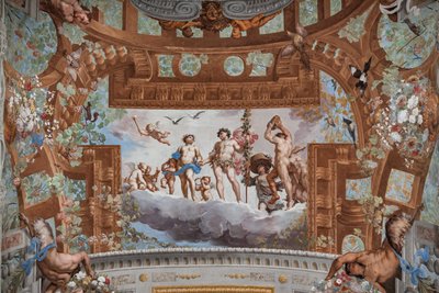 17th century · bacchus · mythological figure · mythology · crown · decoration · faun · fantastic creature · flower · fresco · painting · italy · europe · cloud · weather · palace · satyr · venus · ariadne · garland · · Palazzo Ducale, Gallerie Estensi, Sassuolo, Emilia Romagna, Italy / Bridgeman Images