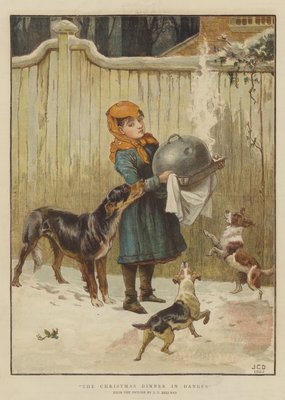 christmas · victorian · dogs · dinner · snow · winter · cold · girl · girls · female · plate · cloche · the graphic christmas number · the graphic · cooking · dangeer · Private Collection / Bridgeman Images · / Look and Learn