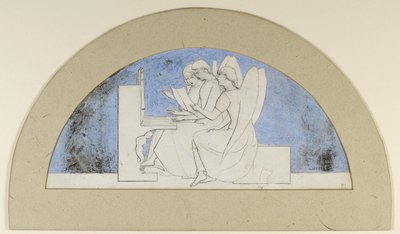 blue · side view · female · women · woman · people · music · religious · sitting · arts · religion · shape · romantic · british · color · colour · profile · angel · century · musical instrument · britain · piano · outline · lady · winged · seated · pastel · romanticism · semi-circle · unfinished · lunette · 19th century · nineteenth century · portrait · gouache · john everett millais · sir john everett millais · john everett millais ra · millais · john everett · romantic era · ashmolean museum · Ashmolean Museum, University of Oxford/Heritage Images