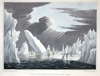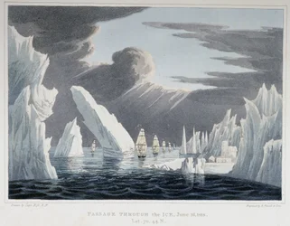 passage · through · voyage · iceberg · icebergs · ship · ships · boat · boats · fleet · seascape · frozen · travel · discovery · exploration · explorer · explorers · traveller · travellers · intrepid · north-west · passage · arctic · north · pole · 19th · century · english · british · 1818 · June · Private Collection / Bridgeman Images