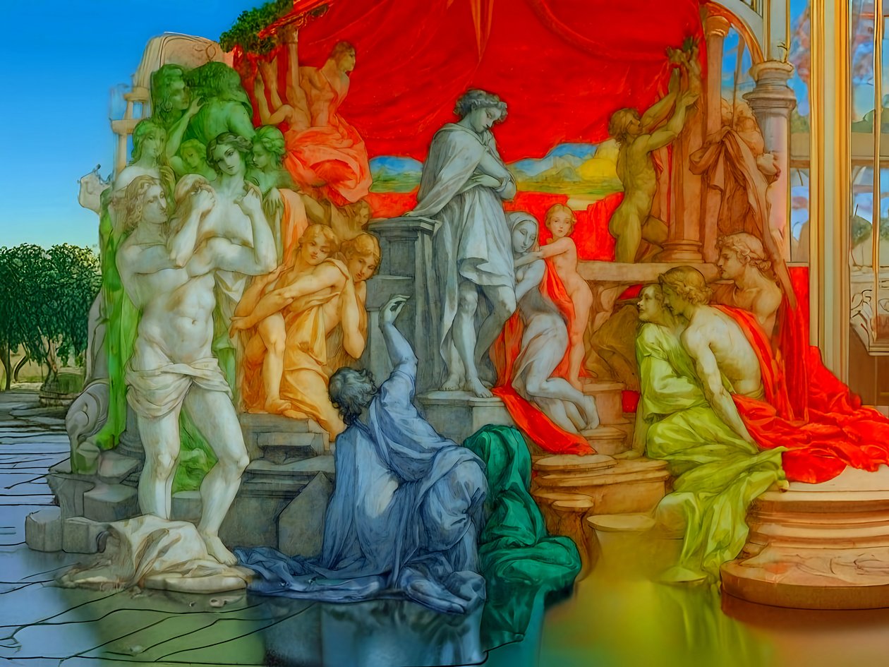 The pictures are based on public domain black and white engravings by Julius Schnorr von Carolsfeld (published in 1860). The individual images have been expanded on all sides, the image content revised, supplemented and colored in the style of the Italian Renaissance painters (Leonardo da Vinci, Titian, Botticelli).