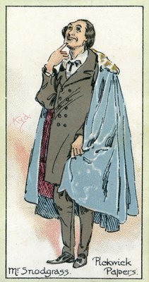 male · portrait · full length · dickensian · victorian · literature · literary · character · caricature · fiction · fictional · novel · cloak · poet · poetic · vintage card · card · pickwick · cigarette card · card · pickwick papers · Private Collection / Bridgeman Images