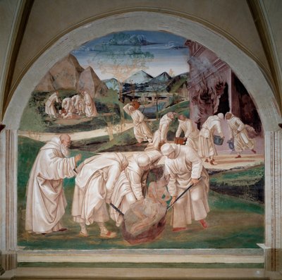 The Problems of Installations of the Monks in Monte Cassino, Saint Benedict Takes Away a Demon from a Stone, in the Background the Monks Find an Idol into the Ground, Another Group Fights Against Fire(The problems of installations of the monks in Monte cassino, Saint Benedict takes away a demon from a stone, in the background the monks find an idol into the ground, another group fights against fire (Fresco)Luca Signorelli |