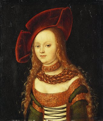 Portrait of a Young Girl, Half Length, Wearing a Green and Gold Costume with a Red Hat(Portrait of a young girl, half length, wearing a green and gold costume with a red hat)Lucas Cranach |