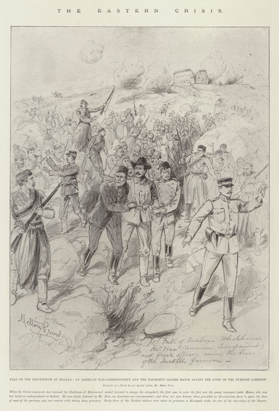 eastern crisis · fall · blockhouse · malaxa · american war correspondent · insurgents leader · manos · saving · lives · turkish garrison · cretan · insurgents · oxford · mr bass · turkish · soldiers · kontopulo · crete · cretan revolts · greek islands · greece · journalists · military · Private Collection / Bridgeman Images · / Look and Learn |