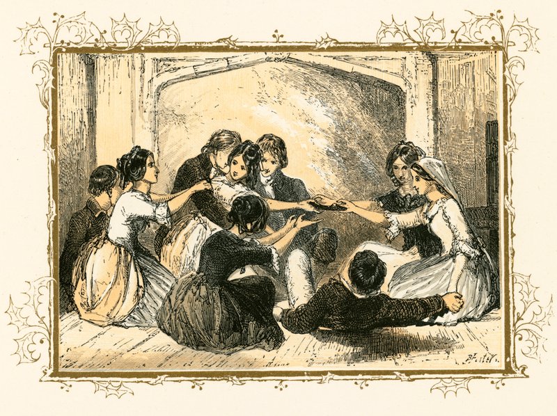 christmas · xmas · christmas sports · games · fire · fireplace · fire place · young · boys · girls · holly border · Private Collection / Bridgeman Images · / Look and Learn |