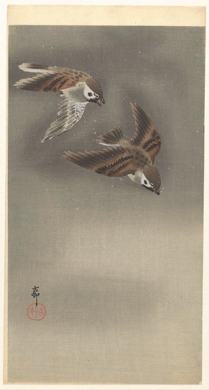 Sparrows in Snow(Ringmussen in sneeuw)Ohara Koson(print maker),Matsuki Heikichi(publisher) |