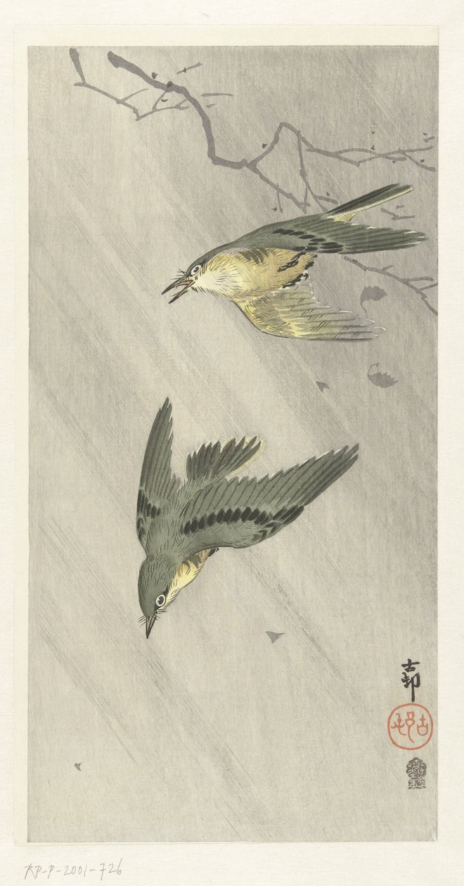 Songbirds in Rain(Zangvogels in regen)Ohara Koson(print maker),Anonymous(print maker),Akiyama Buemon(publisher) |