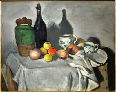 bottle · dessert · dinner · impressionism · art movement · vegetable · food · furniture · still life · ship · onion · table · cezanne paul (1839-1906) · france · europe · painter · artist · · Nationalgalerie, Berlin, Germany / Bridgeman Images