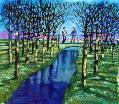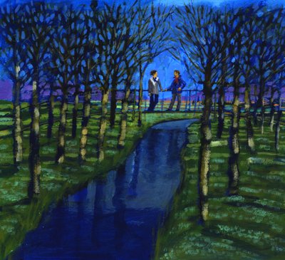 tree · contemporary art · happiness · feeling · countryside · hill · colour · couple · drawing · water · landscape · outside · mzdrawing · 2020s · 21st century · contemporary artist · · Private Collection / Bridgeman Images
