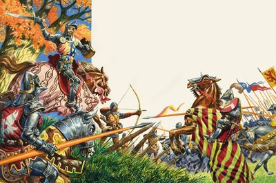 english · french · army · battle of agincourt · henry the fifth · king henry v · archers · longbowmen · longbow · arrows · stakes · battle · Private Collection / Bridgeman Images · / Look and Learn