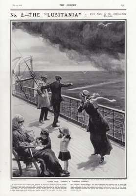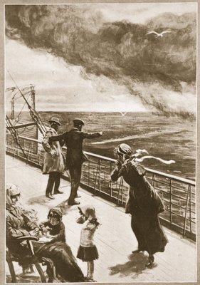 child · united kingdom · europe · first world war (1914-1918) · ship · smoke · female · innocent lives · disaster · civilians · irish sea · casualty · luxury · transatlantic travel · tragic · civilian · ocean · catastrophe · luxury travel · great war · british · passengers · sunk · world war one · casualties of war · tragedy · ocean liner · pointing · 1st world war · german u-boat · male · steamer · fear · horror · torpedoed · funnel · mother · lifeboat · first world war · panic · engraving · Mzengraving · Private Collection / Bridgeman Images