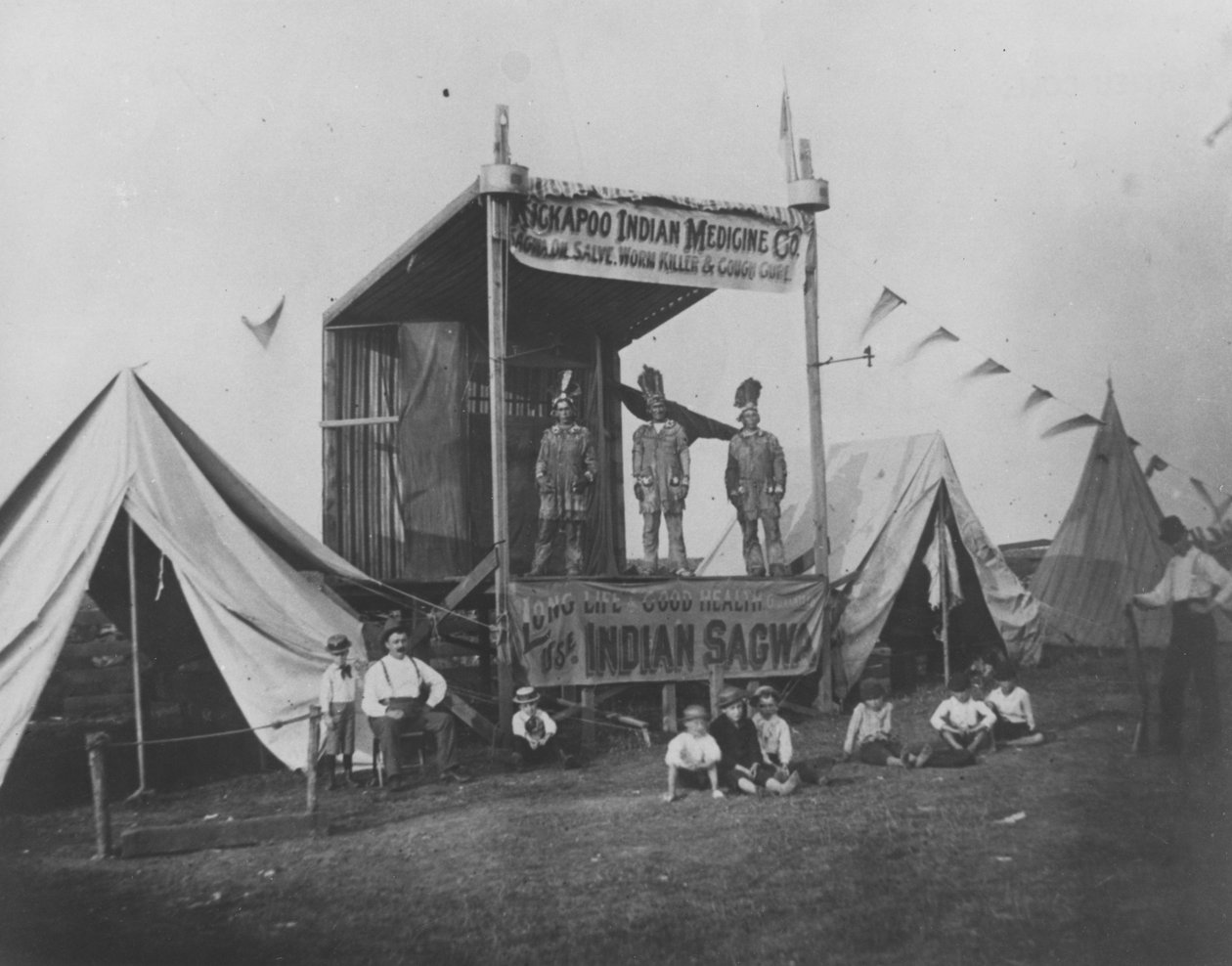 stall · stand · advertising · advertisement · publicity · native american indian · north american indian · stage · medical · tonic · cure-all · salve · fair · fairground · bunting · traditional dress · costume · tents · rural · travelling · remedy · pharmaceutical · patent · patented · pharmacauticals · cure · Hagley Museum & Library, Wilmington, Delaware, USA / Bridgeman Images |