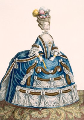 Lady's elaborate court dress, decorated with swags and lace, engraved by Voysard, plate no.46 from 'Galeries des Modes et Costumes Francais'(Lady's elaborate court dress, decorated with swags and lace, engraved by Voysard, plate no.46 from 'Galeries des Modes et Costumes Francais', c.1778-87 99:clothing; traditional dr)Pierre Thomas Le Clerc |