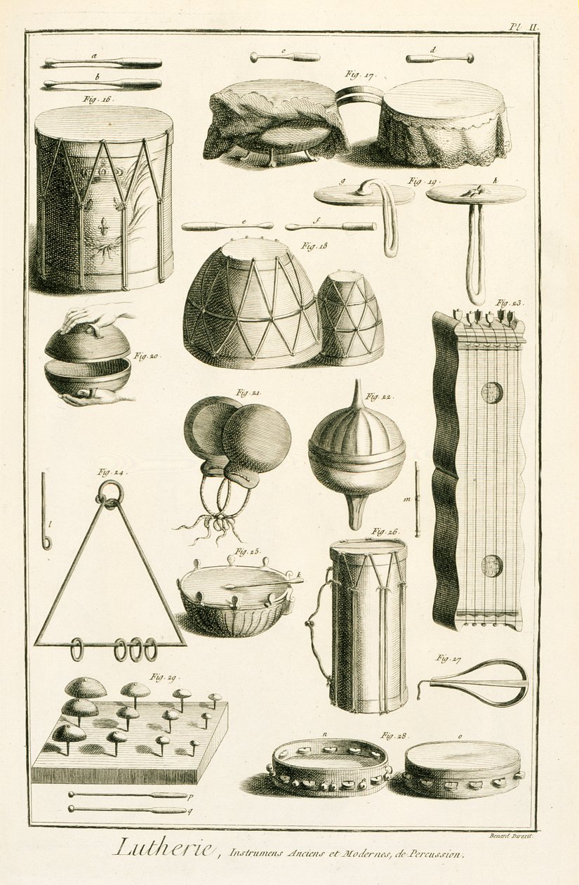 Plate II: Ancient and modern percussion instruments from the Encyclopedia of Denis Diderot and Jean le Rond d'Alembert(Plate II: Ancient and modern percussion instruments from the Encyclopedia of Denis Diderot (1713-84) and Jean le Rond d'Alembert (1717-83), 1751-72 )Robert Benard |