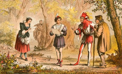 shakespeare william (1564-1616) · as you like it · female · corin · scene ii · coloured etching · character · play · act iii · male · english literature · shepherd · characters · illustration · shakespearean · rosalind · jester · Private Collection / Bridgeman Images