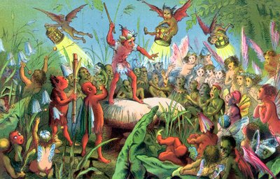 shakespeare william (1564-1616) · play (theatre) · midsummer night's dream · fairy · undergrowth · toadstool · song · creatures · fantasy · flying · woodland · fantastical · illustrated library · singing · creature · dreamlike · winged · illustrations · fairies · toadstools · mythical · lanterns · illustration · shakespearean · midsummer night's dream · Private Collection / Bridgeman Images