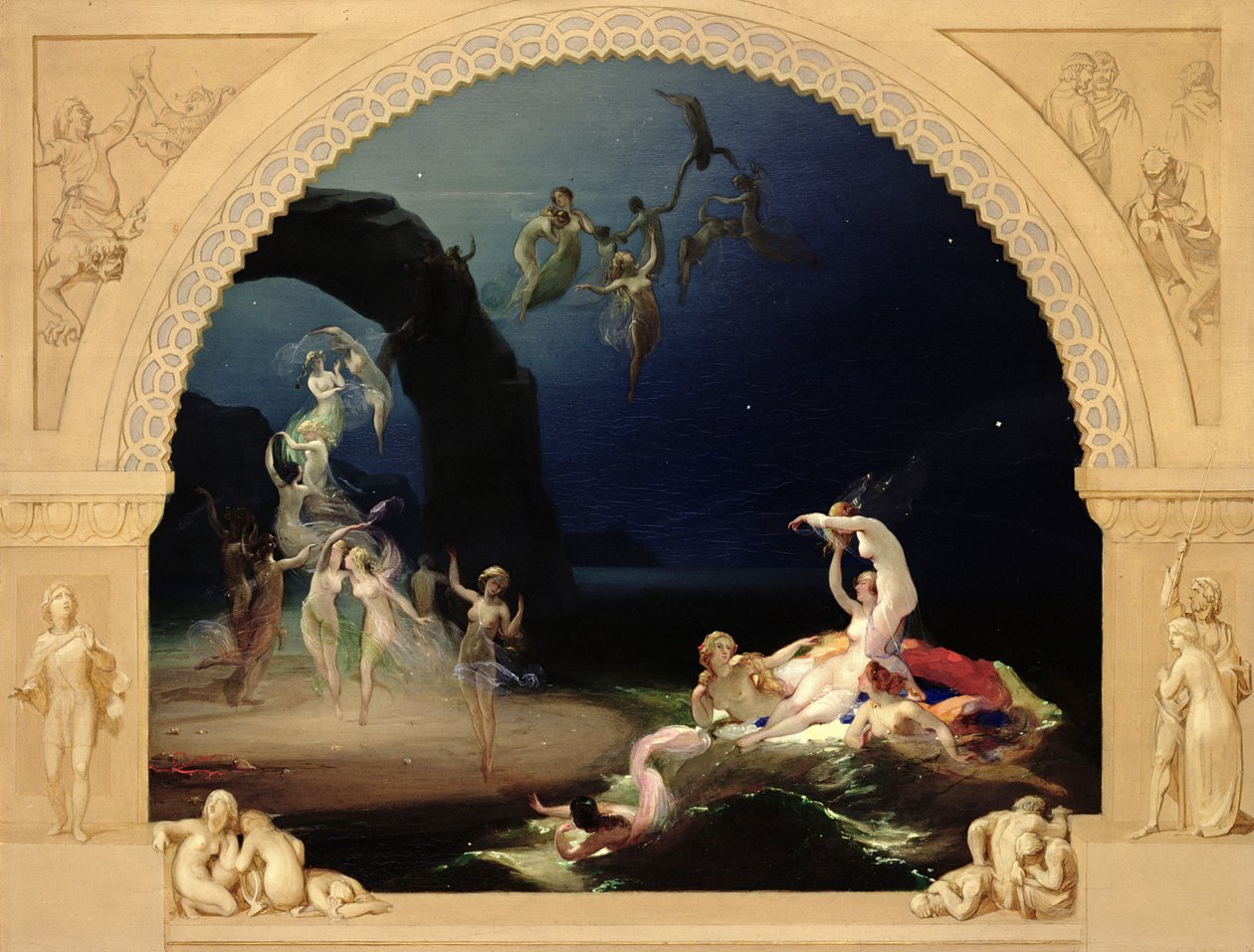 fairy · fairies · dancing · beach · mermaids · night · moonlight · the tempest · floating · trompe loeil arch · Private Collection / Bridgeman Images |