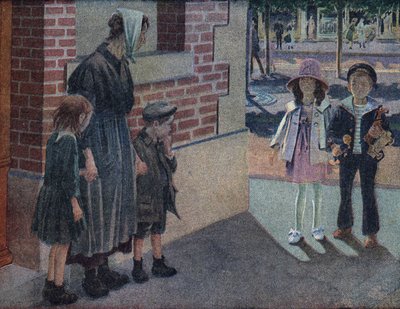 Charity: A Mother and Her Two Children Ask for Alms from a Young Boy and a Young Girl on the Street Who Will Give Them Their Savings and Toys. Illustration by Robert Salles (1871-1929) in 'Je sais Lire'(Charity: a mother and her two children ask for alumone from a young boy and a young girl on the street who will give them their savings and toys. Illustration by Robert Salles (1871-1929) in “” Je sais Lire””.)Robert Salles |