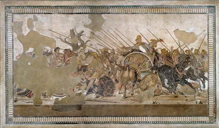 The Alexander Mosaic, depicting the Battle of Issus between Alexander the Great and Darius III in 333 BC, Roman floor mosaic removed from the Casa del Fauno(The Alexander Mosaic, depicting the Battle of Issus between Alexander the Great (356-323 BC) and Darius III (d.330 BC) in 333 BC, Roman floor mosaic removed from the Casa del Fauno (House of the Faun))Roman |