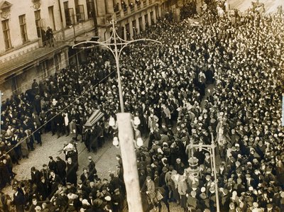 20th century · coffin · russia · moscow · twenties · u.s.s.r. · crowd · street scene · poetry · literature · funeral · procession · story · history · Photography · Russian State Film and Photo Archive, Krasnogorsk / Bridgeman Images