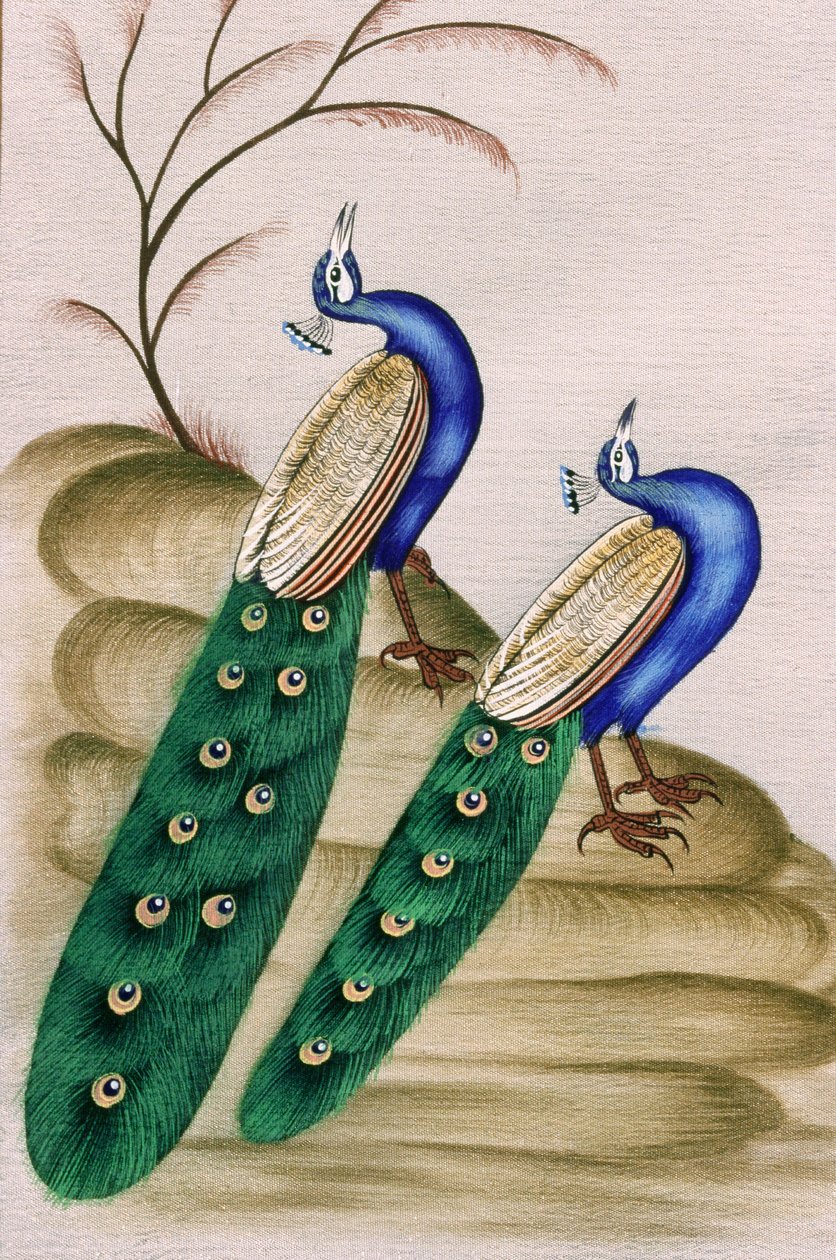 animal · beauty · india · asia · outdoor · birds · green · places · craft · painting on paper · colourful · forest · neck · handiwork · feathers · handicraft · fowls · wall · couple · miniature · blue · peacock · painting · illustration · zoo · Private Collection / Bridgeman Images