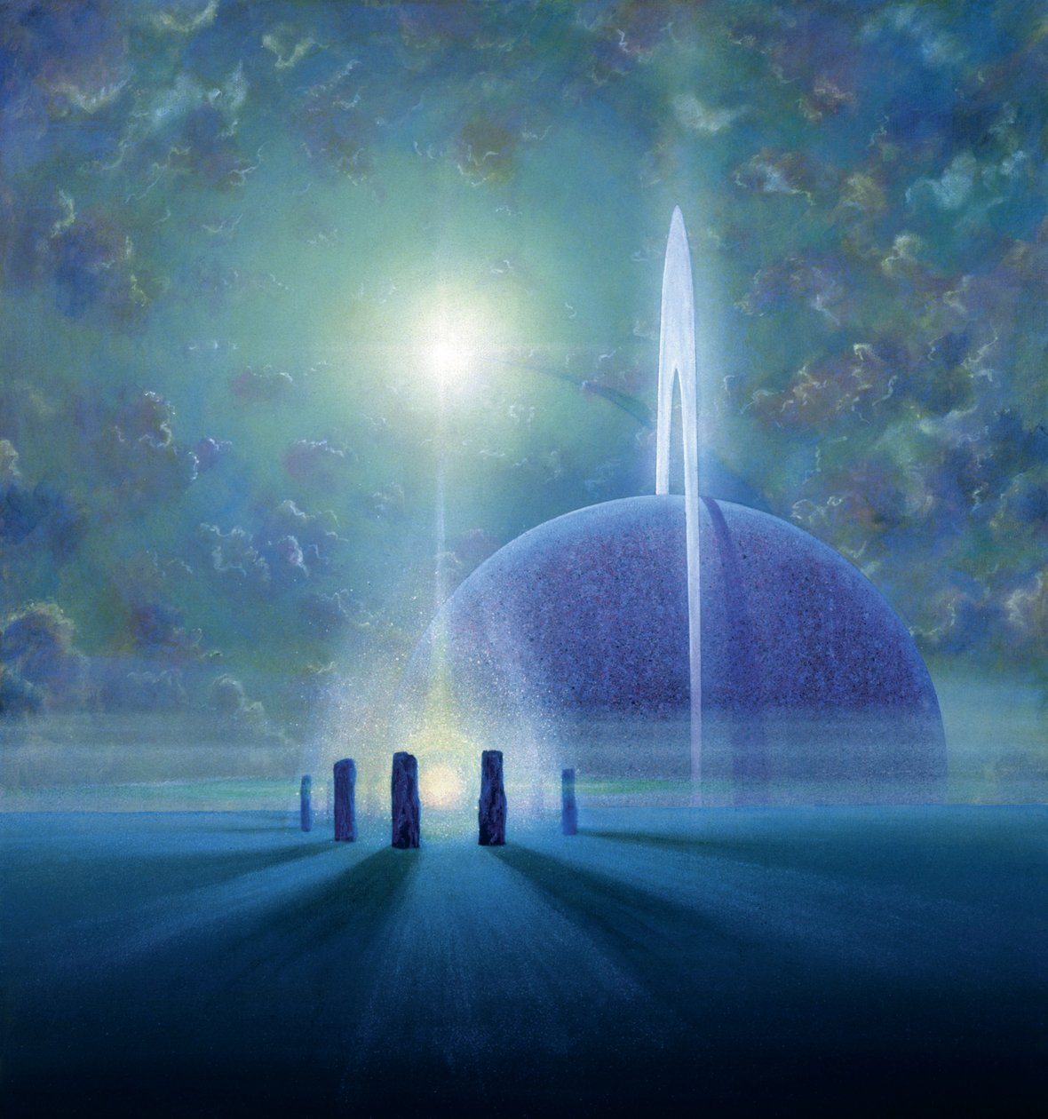 light · planet · saturn · ring · moonlight · nocturne · monoliths · monolith · standing stones · landscape · fantastical · imaginary · atmospheric · shadows · spiritual · religious · fantasy · Private Collection / Bridgeman Images |