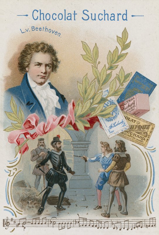 educational · card · portrait · ludwig von beethoven · german · 18th century · 19th century · composer · music · classical music · piano · keyboard · chocolat suchard · advertising · Private Collection / Bridgeman Images · / Look and Learn |