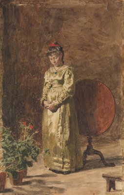 portrait · female · people · girl · girls · looking · yellow · arts · painting · country · museum · golden · dress · gold · location · century · thinking · meditating · looking down · one person · posture · hands clasped · watercolour · gouache · united states of america · colour · the met · metropolitan museum of art · the metropolitan museum of art · 19th century · nineteenth century · american · america · portrait · united states · gold colour · thomas eakins · thomas cowperthwait eakins · courtyard · eakins · thomas · heritage art · watercolor and gouache on off-white wove paper · watercolor and gouache on off-white wove paper · Heritage Art/Heritage Images