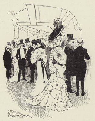 the empire promenade · leicester square · london · west end · the empire theatre · demi-monde · naughty nineties · illustration · graphic · drawing · high society · upper class · prostitutes · licentious · victorian · social scene · decadent · decadence · Private Collection / Bridgeman Images