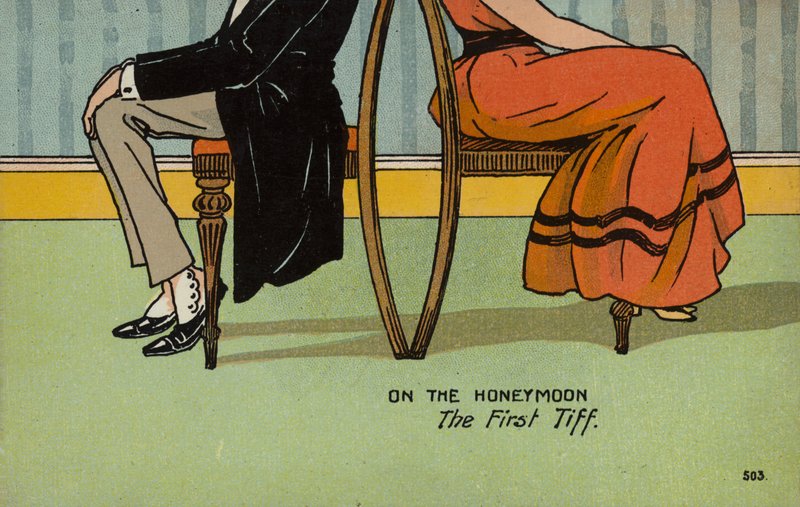 humour · funny · humorous · on the honeymoon · the first tiff · husband · wife · early · back · chairs · no speaks · argument · dissension · marital · unhappiness · cartoon · Private Collection / Bridgeman Images · / Look and Learn |