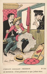 postcard · postcards · cartoon · cartoons · comic · joke · jokes · caption · captions · funny · kissing · childrens nanny · nannies · child · children · girl · girls · daughter · daughters · rocking horse · stolen kiss · door · doors · wife · wives · mother · mothers · nursery · nurseries · playing · play · uniform · uniforms · Private Collection / Bridgeman Images · / Look and Learn |