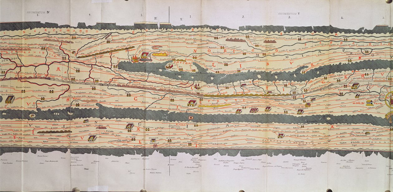 cartography · geography · geographical · river · rivers · world · settlements · roads · road · tabula peutingeriana · military · roman empire · ancient rome · roma · city · capital · cities · towns · transport · imperial · geography · medieval copy · geographical · c13th · roman · network · road map · route · roman road · itinerary · planisphere · tabula peutingerina · peutinger · table · tabula · miles · distances · distance · cursus publicus · europe · africa · north africa · mediterranean · coast · settlement · tribes · adriatic · germany · switzerland · austria · slovenia · tunisia · italy · croatia · hungary · milan · genoa · trieste · vienna · budapest · rome · Ravena · Danube · Osterreichische Nationalbibliothek, Vienna, Austria / Bridgeman Images