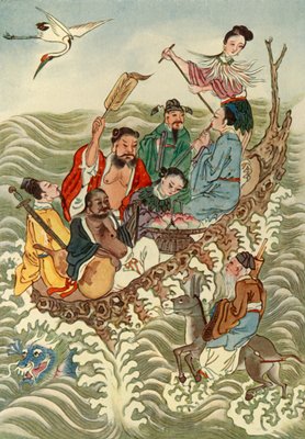 travel · transport · zhongli quan · han xiangzi · zhang guolao · g g co · gg co · myths and legends of china · edward tc · etc werner · edward theodore chalmers werner · cao guojiu · he xiangu · lu dongbin · transportation · ocean · animal · people · male · group · animals · religious · oriental · education · teamwork · boat · boats · arts · bird · birds · country · crossing · power · religion · skill · china · chinese · book · basket · crane · geography · voyage · journey · color · location · century · literature · mule · mules · dynasty · concept · immortal · immortality · mythology · scholar · twenties · qing dynasty · divine · colour · water transport · 1920s · 20th century · daoism · taoism · geographical feature · lan caihe · illustration · portrait · unknown · g g harrap co · harrap · gg harrap co · eight immortals · edward tc werner · werner · edward werner · quing dynasty · li tieguai · george g harrap co · chung-li chuan · The Print Collector/Heritage Images