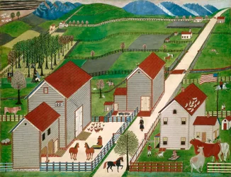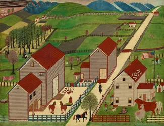 exterior · outdoors · animal · countryside · building · agriculture · field · fields · people · animals · horses · horse · arts · painting · flag · flags · country · cows · farm · color · washington · rustic · farmhouse · farmland · location · century · banner · pennsylvania · gallery · homestead · concept · standard · farmyard · art gallery · folk art · oil painting · united states of america · colour · 19th century · national gallery of art · nineteenth century · rural · american · america · rural life · united states of amercia · outside · landscape · united states · unknown · regionalism · art centre · painting · heritage art · naïve art · oil on window shade · Heritage Art/Heritage Images