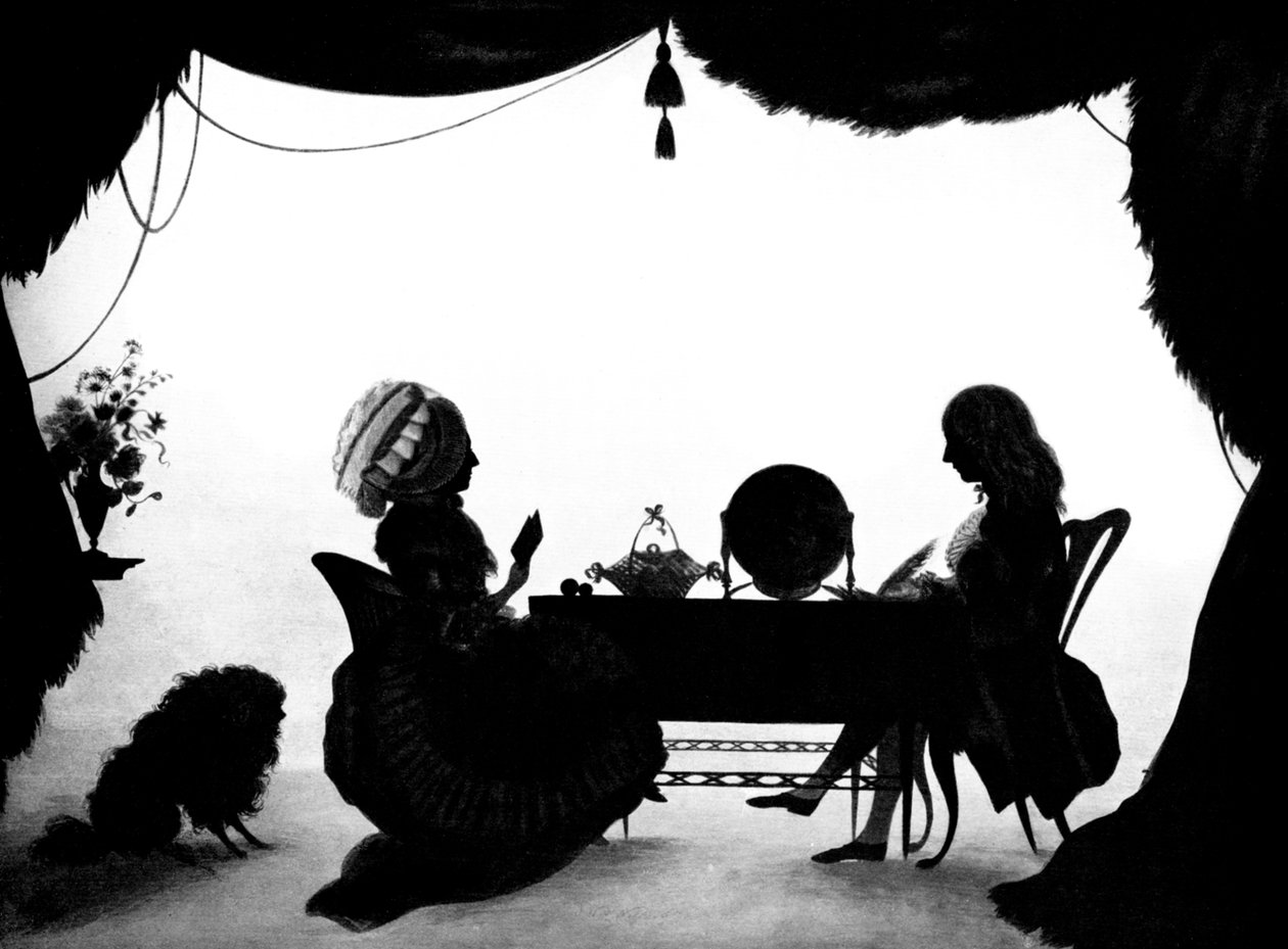 silhouette · animal · england · female · women · woman · people · male · sitting · arts · country · clothes · british · english · profile · dress · table · location · britain · furniture · lady · seated · monochrome · poodle · black white · black and white · bw · portrait · unknown · torond · torond · The Print Collector/Heritage Images |