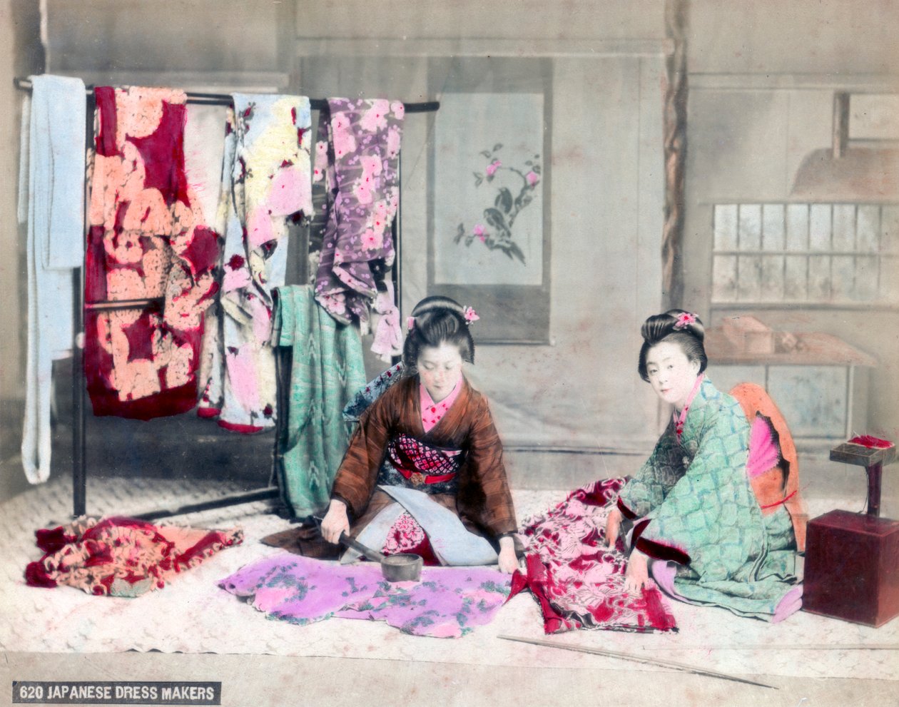 female · women · woman · people · interior · sitting · country · costume · occupation · clothes · color · colour · japan · japanese · dress · kimono · location · material · textiles · profession · fabric · cloth · silk · textile · lady · dressmaker · seated · dressmaking · textile worker · textiles worker · photograph · unknown · The Print Collector/Heritage Images