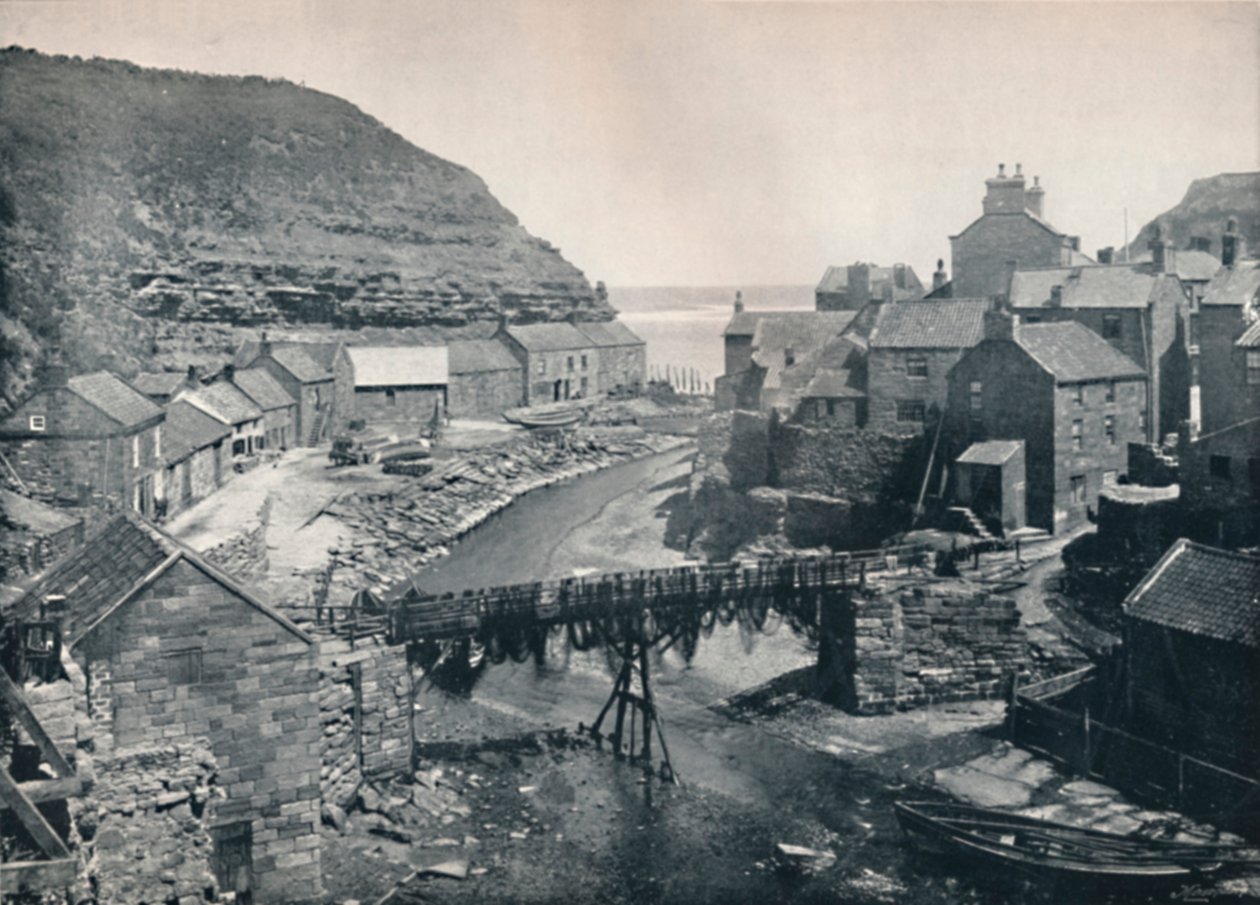 exterior · outdoors · river · coast · building · buildings · england · house · arts · coastal · book · bridge · seaside · british · geography · village · location · century · community · britain · fishing village · literature · outside · north yorkshire · united kingdom · monochrome · staithes · 19th century · black white · black and white · nineteenth century · geographical feature · george · photograph · landscape · unknown · george newnes · newnes · george newnes ltd · round the coast · The Print Collector/Heritage Images |