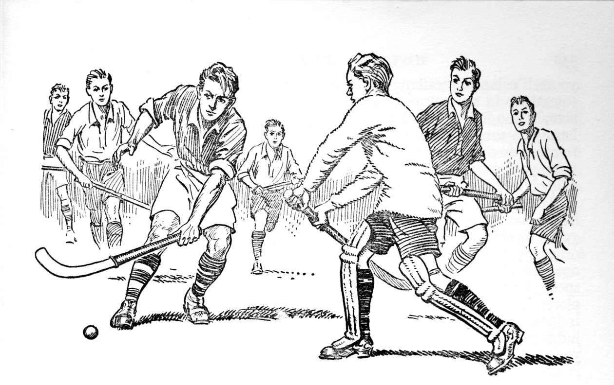 outdoors · people · child · children · sport · arts · playing · book · clothes · dress · schoolchildren · hockey · comic · century · shorts · schoolchild · protective clothing · clothing · thirties · literature · hockey stick · rivalry · schoolboy · schoolboys · monochrome · black white · black and white · 1930s · 20th century · publishers · shin-pads · portrait · hockey ball · hockey pitch · boys own · unknown · parrish · odhams press · childrens golden treasure book · john r crossland · crossland · john r · jm parrish · The Print Collector/Heritage Images |