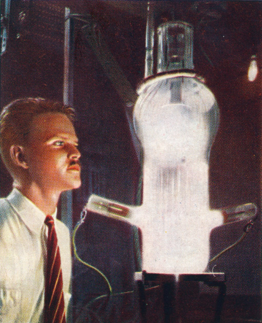 glass · people · male · technology · engineering · science · electricity · grid · watching · current · glowing · innovation · century · thirties · concept · physics · invention · vacuum tube · 1930s · 20th century · chromolithograph · unknown · cigarette card · The Print Collector/Heritage Images |