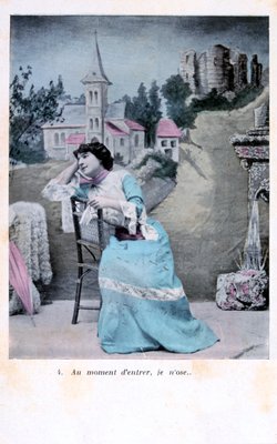 exterior · portrait · female · women · woman · people · communications · town · sitting · country · french · france · dress · chair · location · century · thinking · handkerchief · exhaustion · postcard · clothing · print · furniture · lady · concept · outside · longing · postal service · 20th century · art media · portrait · postcard · unknown · Art Media/Heritage Images