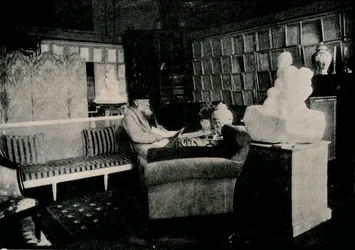 road · studio · people · male · interior · indoors · library · study · street · arts · france · paris · sculpture · book · reading · room · lane · avenue · seat · artist · location · century · inside · sofa · settee · furniture · literature · sculptor · one person · monochrome · publication · black white · black and white · ile-de-france · 1900s · 1910s · 20th century · auguste rodin · photograph · portrait · unknown · auguste · rodin · studio publications · studio volume 72 · rue de varenne · francois auguste rene rodin · The Print Collector/Heritage Images